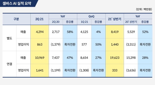 셀바스 AI는 2021년 2분기 별도 기준 매출액이 전년 동기 대비 58% 증가한 43억원을 기록했다고 17일 공시를 통해 밝혔다.