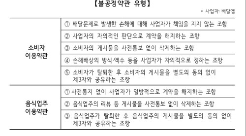 이에 공정위는 상위 배달앱 사업자(배달의민족 49.7%, 요기요 39.3%)가 소비자 및 음식업주와 체결한 약관 상 일부 조항에 대한 불공정약관심사를 진행했다.