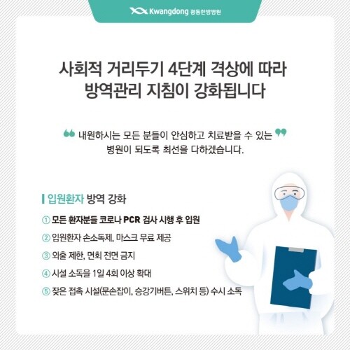 코로나19 확산 방지를 위해 마련된 병원 내 방역지침은 △모든 환자는 PCR검사 시행 후 입원 △입원환자 손소독제 및 마스크 제공 △외출 제한 및 면회 전면금지 △1일 4회 시설소독 △잦은 접촉시설물 수시소독 등을 통해 바이러스 차단에 집중하고 있다.