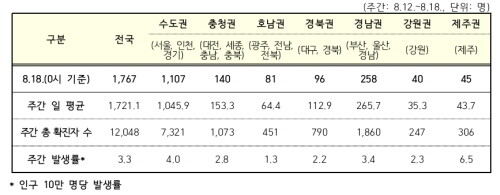 중앙방역대책본부는 18일 0시 기준 국내 발생 신규 확진자는 1767명이며(최근 1주간 일 평균 1721.1명), 수도권에서 1107명(62.6%) 비수도권에서는 660명(37.4%)이 발생했다고 밝혔다.
