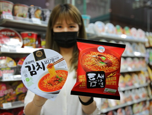 | ▲ 모델이 친환경 포장재로 만든 오모리 김치찌개 라면과 틈새라면을 들고 포즈를 취하고 있다. (사진= GS리테일 제공) |