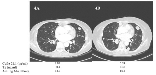 | ▲폐전이가 있는 57세 갑상선암 환자의 폐 CT 1년 전후 사진, 사진을 보면 암이 커지고 전이가 진행하는것을 볼수 있다. Cyfra 21.1 (ng/ml) 수치는 1.87에서 5.24로 증가하는 추세로 갑상선암이 진행되는 것을 알 수 있다. 하지만 현재 지표로 쓰이는 티로글로불린(ng/ml)은 같은 기간 동안 0.4에서 0.36으로 변화가 없어 병의 진행을 알 수가 없다. (사진=의정부성모병원 제공) |