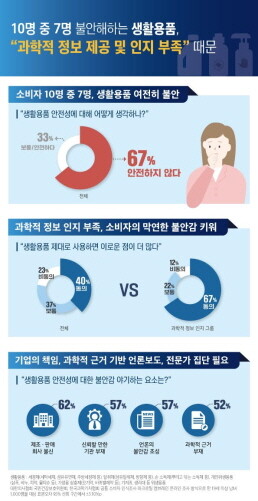 소비자 10명 중 6.7명은 생활용품이 안전하지 않다고 생각하고 76%가 화학물질을 합성해 만든 제품은 위험할 수 있다3고 답한 것으로 나타났다.