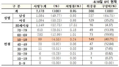 또한 코로나19 위중증 환자는 8월 18일 0시 기준 366명으로 접종완료율이 가장 낮은 50대가 40.7%로 가장 많았으며, 60대가 20%로, 50~60대가 60%이상을 차지하는 것으로 나타났다.