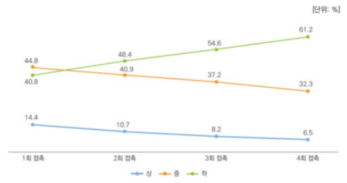 자살위험도 비교 시 사후관리 초기와 비교하면 4회 진행 시 자살위험도가 높은 사람의 비율은 의료비 비수혜자가 7.7%p 감소한 반면, 의료비 수혜자는 10.6%p 감소하였다.