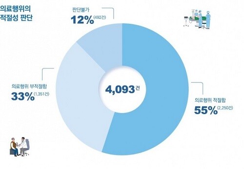 지난 4년간 감정 완료된 4093건의 감정결과 중 의료행위의 적절성을 판단한 결과를 보면 ‘적절함’이 2250건으로 55.0%, ‘부적절함’이 1351건으로 33.0%를 차지하는 것으로 나타났다.