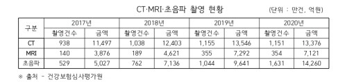 CT는 2017년 1964대에서 2020년 2104대로 늘어났고, MRI는 2016년 1425대에서 2020년 1775대로 늘어났으며 초음파도 2016년 2만7161대에서 2020년 3만5660대로 대폭 늘어났다.