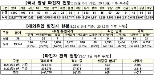중앙방역대책본부는 22일 0시 기준 국내 발생 신규 확진자 1590명, 해외유입 사례 38명 등 신규 확진자 1628명이 확인돼 총 누적 확진자 수가 23만6366명(해외유입 1만3149명)이라고 밝혔다.