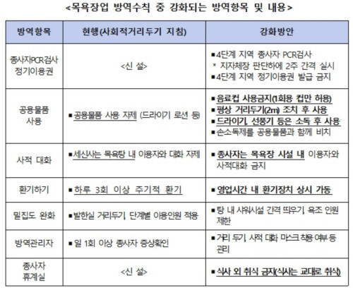 | ▲목욕장업 방역수칙 중 강화되는 방역항목 및 내용 (사진=복지부 제공) |