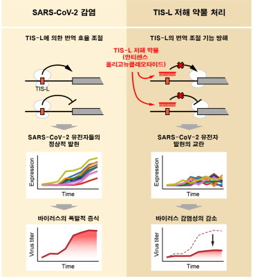 나아가 이렇게 얻은 사스코로나바이러스-2 번역체 지도를 토대로 바이러스의 단백질 생성 효율을 조절하는 신규 인자를 발굴하고 TIS-L(translation initiation site located in the leader)이라 이름 지었다. 여기에는 사스코로나바이러스-2 유전체의 리더 지역에 위치한 번역 시작 부위라는 의미를 담았다.