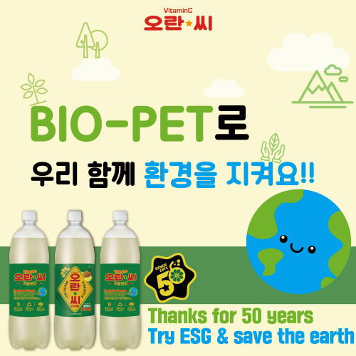 오란씨 바이오페트는 사탕수수 추출 원료를 30% 적용한 친환경 페트로, 기존 플라스틱 페트 제품 대비 제조, 유통, 소각 전 과정에서 배출되는 이산화탄소(CO2) 발생량을 20% 이상 줄이는 것은 물론 100% 재활용 및 재사용이 가능하다.