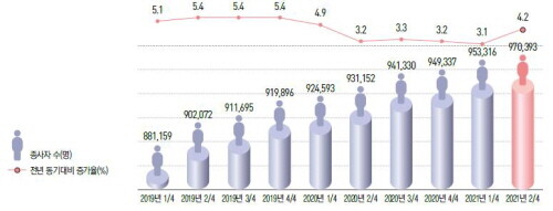 | ▲2021년 2·4분기 보건산업 종사자 수 (사진=한국보건산업진흥원 제공) |