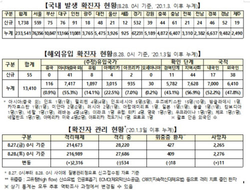 중앙방역대책본부는 28일 0시 기준으로, 국내 발생 신규 확진자는 1738명, 해외유입 사례는 55명이 확인되어 1793명 늘어 총 누적 확진자 수는 24만6951명(해외유입 1만3410명)이라고 밝혔다.