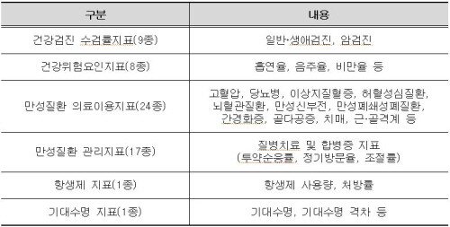 공단이 보유한 진료 데이터와 건강검진 데이터를 분석하여, 주요 만성질환 발생 전 건강위험요인 보유율부터 발생 후 합병증 발생까지 질병 진행단계별로 산출한 자료로 건강검진 수검률지표, 건강위험요인지표, 만성질환 의료이용지표, 항생제 처방지표, 기대수명지표 등 57종을 2002년 자료부터 년단위 자료를 제공해 왔다.