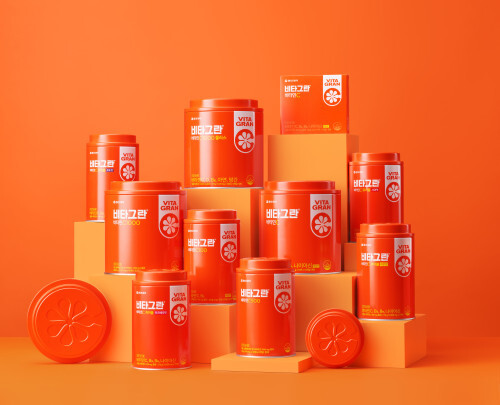 또 비타민C 제품이라는 것을 보다 직관적으로 알 수 있도록 오렌지를 반으로 자른 심볼을 새롭게 적용하고, 제품 패키지 메인컬러를 주황으로 통일했다. 또한, 용기의 활용도 및 재활용이 용이하도록 틴케이스(물건을 담을 수 있도록 만든 철재 상자)를 적용했다.