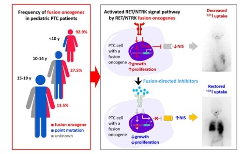 특히, 방사성 요오드 치료에도 불구하고 폐 전이가 진행한 어린 소아 2명의 종양에서 CCDC6-RET, TPR-NTRK1 변이가 확인됐는데, SLC5A5 발현이 낮았고, 방사성 요오드의 전이암 조직 내 흡수율이 낮았다.
