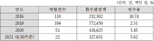 사무장병원 적발에 따른 해당 병원 건강보험공단 진료비 환수결정 금액은 ▲2018년 2323억200만원 ▲2019년 7724억5000만원 ▲2020년 4166억2500만원 ▲2021년 6월까지 1276억3100만원이며, 총액은 1조5490억800만원에 달하는 것으로 나타났다. 징수율은 2018년 10.74%에서 2019년 2.51%로 크게 줄었다가 작년 3.45%로 소폭 상승했다.