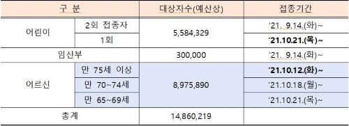 문제는 접종률이 높은 65세이상 어르신 897만명의 접종시기가 오는 10월 12일부터 3주간 집중돼 있다는 것으로, 19세~49세 코로나19 백신 2차 접종시기와 겹쳐 두 백신 접종 모두 차질이 우려되는 상황이다.