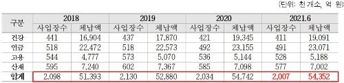 5년간 체납 사업장ㆍ체납금액은 매년 200만여 곳 5조 이상 기록중