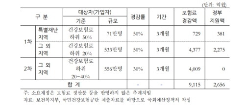 이를 위해 정부는 1차 건강보험료 경감대상인 특별재난지역과 일반지역의 보험료경감 예상액이 5311억200만원(1인당 평균 9만1559원)이 될 것으로 예측하고 그 50%인 2655억5100만원을 2020년 추가경정예산으로 편성했다.