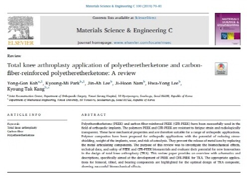 | ▲연세사랑병원 인공관절 연구팀이 최근 SCI급 국제학술지 Materials Science & Engineering C에 ‘PEEK 및 CFR-PEEK 소재의 무릎 인공관절 치환술 적용: 리뷰’ 논문을 게재했다. (사진=연세사랑병원 제공) |