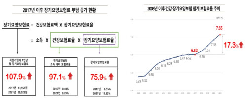 보험료가 2배 이상 급등한 주된 이유는 장기요양보험료율이 2017년 건강보험료의 6.55%에서 2021년 11.52%로 올라 지난 4년(2018년~2021년) 간 75.9%에 달하는 사회보험 역사상 유례없는 인상률을 기록했기 때문이다.