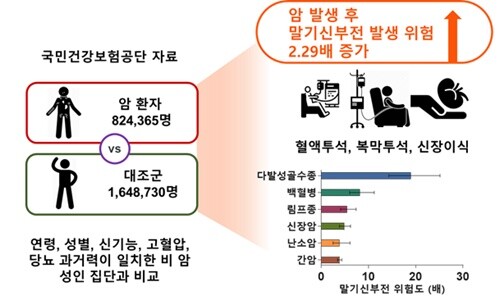 특히, 23종의 세부 암 종별로 분석한 결과 다발성 골수종이 19배로 말기신부전 발생 위험이 가장 높았고, 다음으로 백혈병, 림프종 등 혈액 암이 높은 위험도를 차지했다. 다음으로 신장암, 난소암, 간암 순으로 말기신부전으로의 진행 위험성이 증가했다. 이는 연령, 나이, 흡연, 운동, 비만, 당뇨 및 고혈압 여부에 상관없이 일관된 경향을 보였다.