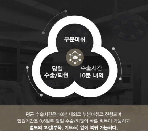 내시경 수술은 간단한 부분마취 후 아기의 손톱만큼 작은 1mm 직경의 수부전용 내시경 장비를 통해 진행된다. 따라서 수술 후 통증이 경미하고, 표적 접근법을 통해 주변 조직을 침범하지 않는 직접접근 방식으로 진행된다. 따라서 당일 수술, 퇴원 원스톱 치료로 진행되며 별도의 고정치료 없이 빠른 일상복귀가 가능하다.