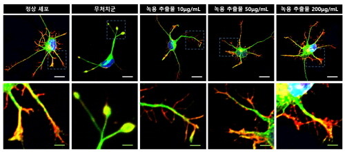 그 결과 녹용 추출물을 처리한 신경세포의 생존율이 크게 증가해 신경보호효과가 탁월함을 확인했다. 아울러 신경세포의 신경정보 전달 통로인 축삭돌기 회복도 빠르게 촉진됐다.