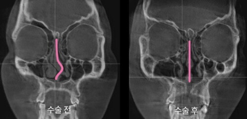 | ▲휘어있는 비중격과 수술 이후 곧아진 비중격 모습. (사진=아이디병원 제공) |