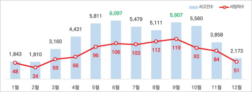 월별로 살펴보면 자전거 교통사고건수는 6월(6097건)에 이어 9월(5907건)에 많이 발생했다. 9월 자전거 교통사고는 전체 교통사고의 11.5%를 차지했으며 특히 사망자 수가 119명으로 가장 많이 발생한 것으로 분석됐다.