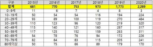| ▲연도별ㆍ연령별 고의적 자해 발생 현황 (사진= 이은주 의원실 제공) |