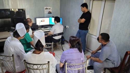 | ▲우즈베키스탄 코칸트 병원에서 현지 의료진에게 원격의료시스템 라임팀에 대해 설명하는 모습 (사진= 파인헬스케어 제공) |