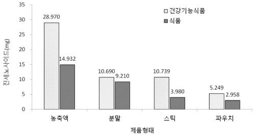 제품 형태별로 일일 섭취량 기준 진세노사이드 평균함량을 비교해보면 건강기능식품이 홍삼 함유 일반 가공식품보다 농축액은 2배, 분말은 1.2배, 스틱형은 2.5배, 파우치형은 1.7배 함량이 높은 것으로 차이를 보였다.