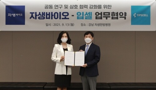 서울시 강남구 자생한방병원 대회의실에서 열린 이번 협약식에는 자생바이오 신지연 대표와 R&D센터 김점용 연구소장, 입셀 주지현 대표, 남유준 연구소장 등 양 기관 주요 관계자들이 참석했다.