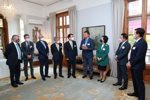 | ▲융감독원의 프론티어1.5D MOU 서명식이 영국대사관에서 13일 개최된 가운데 (오른쪽 첫번째부터) 존림 삼성바이오로직스 대표이사, 조용병 신한금융지주 회장, 김은미 이화여대 총장, 니겔토핑 기후 대응 대사, 정은보 금감원장, 윤종규 KB금융그룹 회장, 김준 SK이노베이션 대표, 최은석 CJ제일제당 대표, 사이먼 스미스 주한 영국 대사 등 참석자들이 대화를 나누고 있는 모습 (사진=금융감독원 제공) |