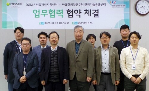 대구경북첨단의료산업진흥재단 신약개발지원센터와 한국한의학연구원 한의기술응용센터는 지난 20일 대구첨복재단 신약개발지원센터에서 합성신약 개발 분야 연구협력을 강화하기 위하여 업무협약을 체결했다고 21일 밝혔다.