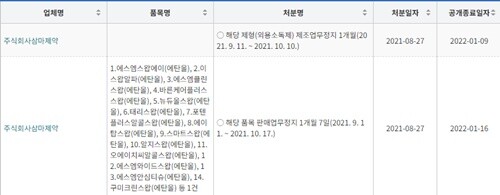 | ▲ 삼마제약이 표시기재 위반과 수탁자 준수사항 위반으로 제조 및 판매업무정지 등에 행정처분을 동시에 받았다. (사진=의약품안전나라 홈페이지 캡처) |