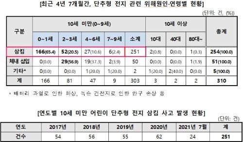 소비자원 소비자위해감시시스템(CISS) 집계에 따르면 2017년부터 올해 7월까지 최근 4년 7개월간 254건의 단추형 전지 삼킴 사고가 접수됐으며, 이 중 ‘0∼1세’ 사고가 166건(65.4%)으로 가장 많았고, ‘2∼3’세 52건(20.5%), ‘4∼6’세 27건(10.6%) 등의 순으로 나타났다.