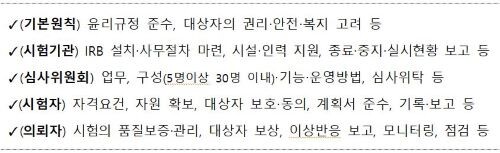 의뢰자 관련으로는 시험의 품질보증ㆍ관리, 대상자 보상, 이상반응 보고, 모니터링, 점검 등을 규정하며, ▲심사위원회의 경우 업무와 구성(5명이상 30명 이내)ㆍ기능ㆍ운영방법, 심사위탁 등이 검토된다.