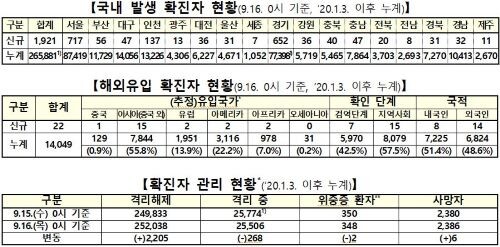 중앙방역대책본부는 16일 0시 기준 국내 발생 신규 확진자 1921명, 해외유입 사례 22명 등 신규 확진자 1943명이 확인돼 총 누적 확진자 수는 27만9930명(해외유입 1만4049명)이라고 밝혔다.