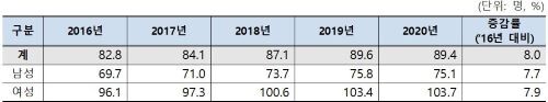 이 중 남성은 2016년 69.7명에서 2020년 75.1명으로 7.7%의 증가율을 보였고, 여성은 2016년 96.1명에서 2020년 103.7명으로 7.9% 늘어났다.