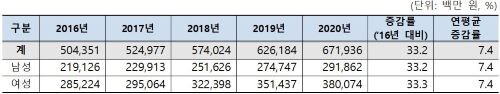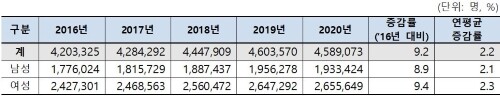 이 중 남성은 2016년 177만6000명에서 2020년 193만3000명으로 8.9%(15만7000명) 증가했고, 여성은 2016년 242만7000명에서 2020년 265만6000명으로 9.4%(22만8000명) 늘어난 것으로 나타났다.