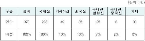 이어 ▲러시아산 13%(49건) ▲중국산 10%(35건) ▲국내산·일본산 7%(25건) ▲국내산·중국산 2%(8건) ▲기타 8%(30건) 등으로 집계됐다.