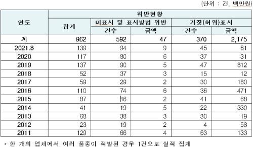 연도별 원산지 위반 건수는 2011년 129건, 2012년 23건, 2013년 68건, 2014년 41건, 2015년 87건, 2016년 110건, 2017년 59건, 2018년 52건, 2019년 137건, 2020년 117건, 2021년(8월까지) 138건으로 조사됐다.