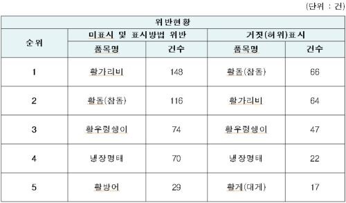 거짓(허위)표시의 경우 활돔(참돔)이 66건으로 1위를 차지했고, 활가리비가 64건으로 2위를 기록했으며 ▲활우렁쉥이(47건) ▲냉장명태(22건) ▲활게(대게) 17건 순으로 집계됐다.