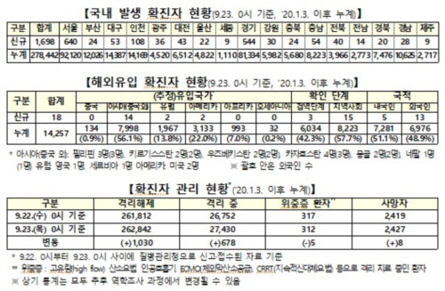 중앙방역대책본부는 23일 0시 기준으로 국내 발생 신규 확진자는 1698명, 해외유입 사례는 18명이 확인되어 1716명 늘어 총 누적 확진자 수는 29만2699명(해외유입 1만4257명)이라고 밝혔다.