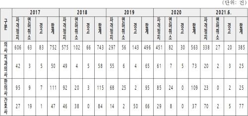 연도별 면허 취소 의료인은 ▲2017년 94명 ▲2018년 164명 ▲2019년 89명 ▲2020년 121명 ▲2021년 6월 31명으로 총 499명에 달하는 것으로 집계됐다.