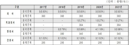 2017년부터 최근 5년 간 면허취소 등 행정처분을 받은 의료인은 총 3976명으로 확인되면서 사회적 책임과 역할을 잘 지킬 수 있게 의료인 자격시험에 의료인 윤리과목을 신설해야 한다는 지적이 제기되고 있다.