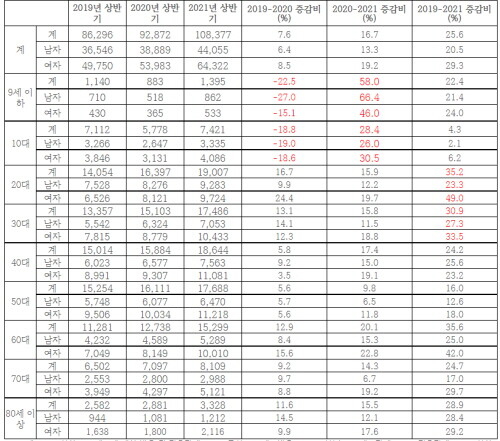 또 전 연령에서 여성이 크게 증가하는 양상을 보였는데 40대의 경우 남성에서 25.6% 증가해 여성(23.2%)보다 소폭 크게 증가한 것으로 나타났다.